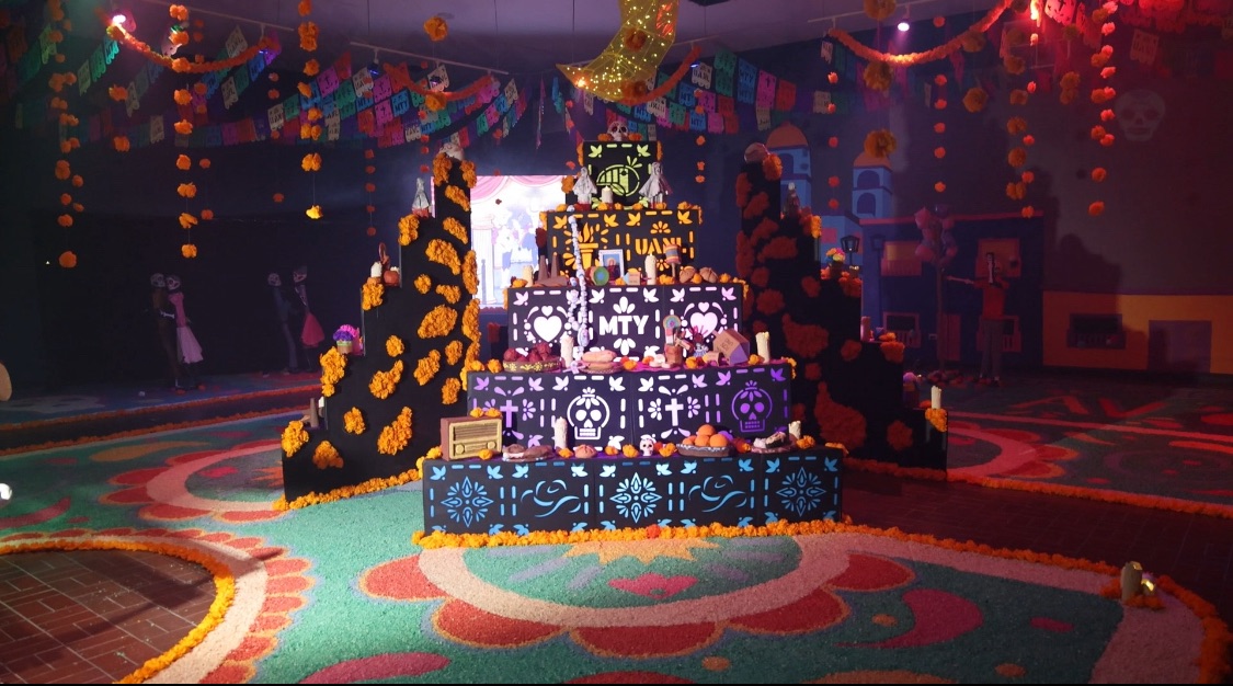 La Dirección de Turismo es Cultura, en colaboración con la Facultad de Artes Visuales de la Universidad Autónoma de Nuevo León, instaló una ofrenda de grandes dimensiones en la modalidad inmersiva.